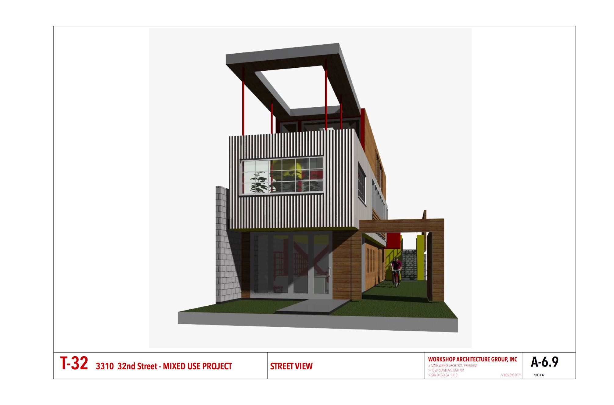 The property is on the edge of the zone, and thus one property line abuts the Residential zone. The Commercial zone requires a 0′ setback, while the Residential zone requires a 10′ setback, and because the lot abuts the residential zone this lot is required to have a 10′ on that property line… thus the long outdoor, courtyard like space shown in some of the renderings. Another example of how in design, a potential restriction (problem) can become an asset to the project (as well as to the neighbors). Our dogs like it too.
